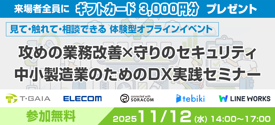 製造業界向けに業務用デバイスの活用・運用改善をテーマにしたオフラインセミナー「攻めの業務改善×守りのセキュリティ:中小製造業のためのDX実践セミナー」を開催します。